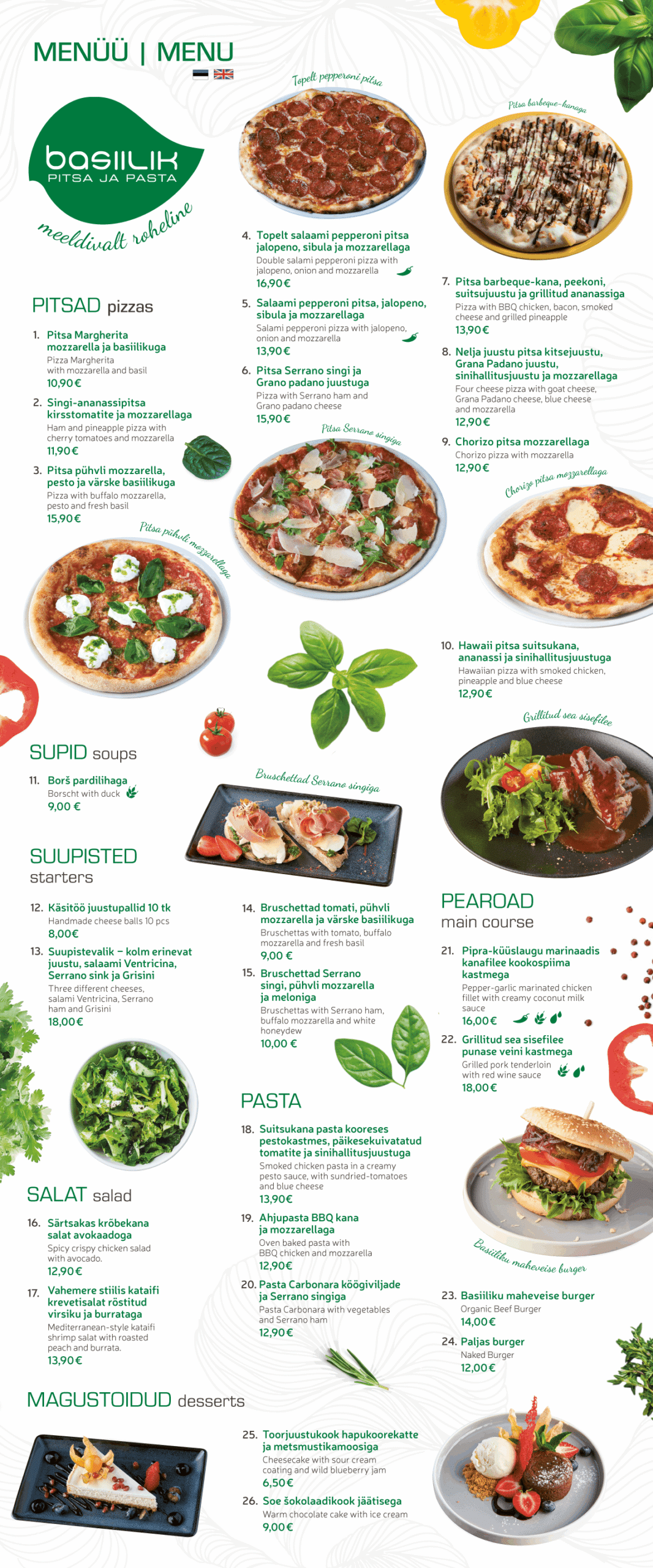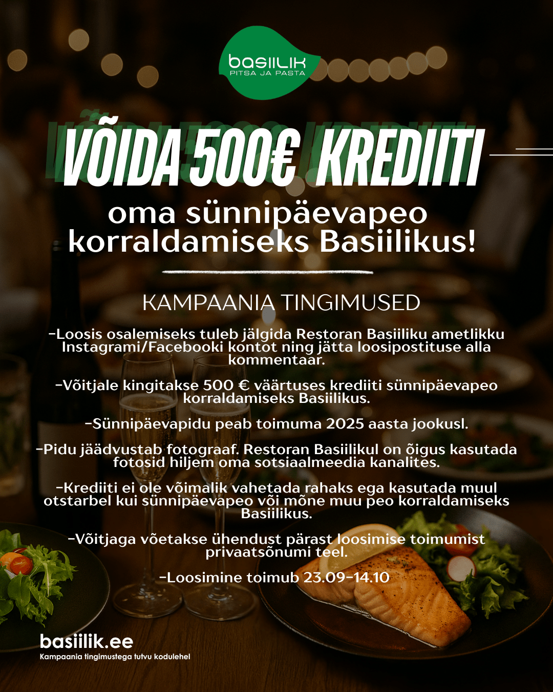 Restoran Basiilik pakub suurepärast võimalust meeleoluka koosviibimise, sünnipäeva, pulma või firmapeo korraldamiseks. Meie hubases ja stiilses interjööris saate nautida maitsvat toitu ja jooke, ning tunda ennast hoituna. Mahutame oma avarasse saali kuni 70 inimest. Teisel korrusel saab korraldada privaatselt koosviibimisi kuni 20 inimesele. Võta meiega julgelt ühendust ja leiame teile parima lahenduse!